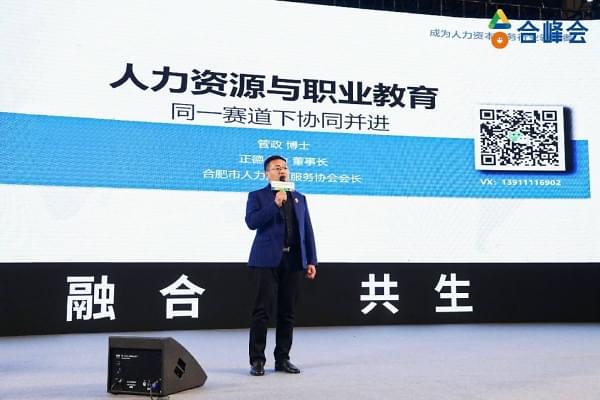 合肥市人力資源服務(wù)協(xié)會(huì)會(huì)長(zhǎng)、正德人力董事長(zhǎng)管政博士,做了《人力資源與職業(yè)教育:同一賽道下協(xié)同并進(jìn)》的主題演講,首先從統(tǒng)領(lǐng)全局的高度,拋磚引玉式的引起參會(huì)者的強(qiáng)烈反響與共鳴。