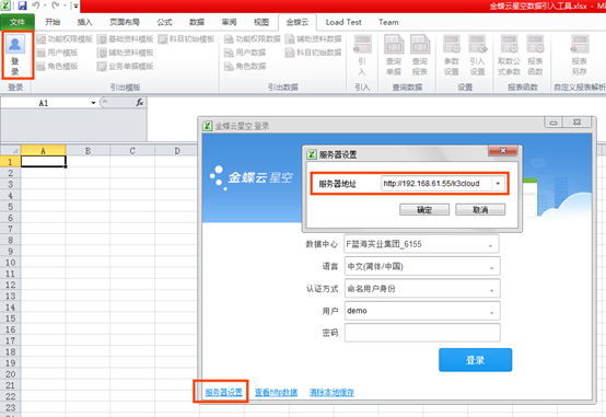 第三步:在【金蝶云】頁簽點擊【登陸】按鈕登陸系統(登陸前需要先設置好服務器地址)。
