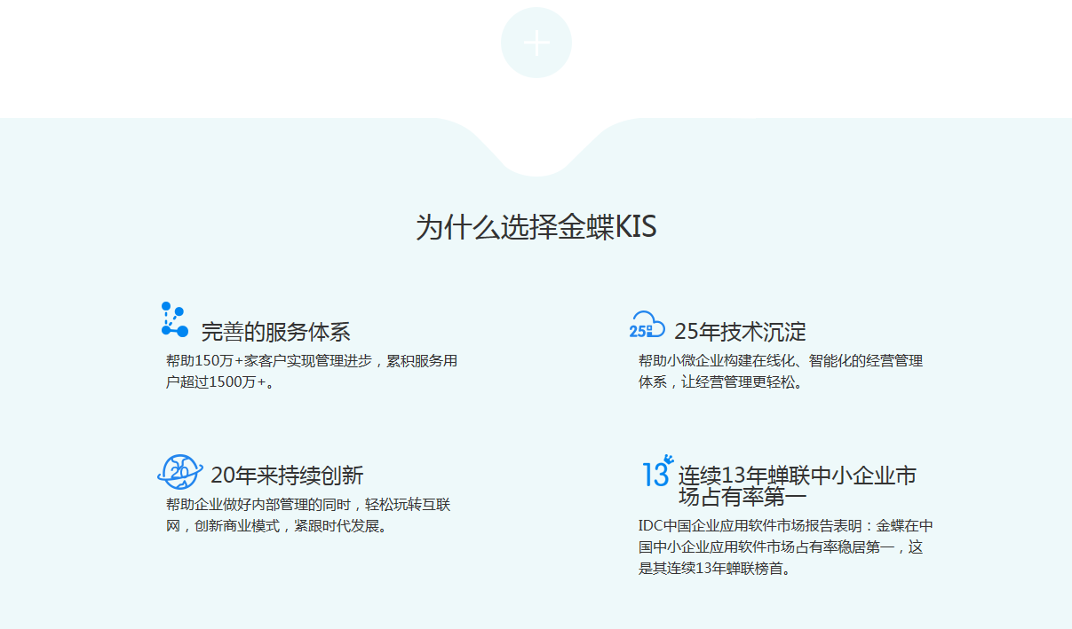 ?金蝶KIS云專業(yè)版:服務于從事生產(chǎn)銷售的小微工貿(mào)企業(yè),通過云模式部署,隨時隨地掌控業(yè)務經(jīng)營狀況,實現(xiàn)企業(yè)上云辦公