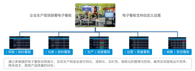 ●系統預設采購收料、倉庫發料、生產進度、質量、銷售發貨等看板,并支持全新自定義看板。